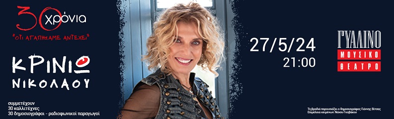 30 χρόνια Κρινιώ Νικολάου τη Δευτέρα 27 Μαΐου στο Γυάλινο Μουσικό Θέατρο