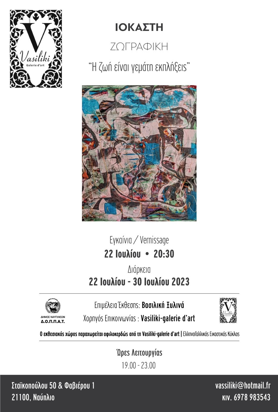 Εγκαίνια της ατομικής έκθεσης της εικαστικού Ιοκάστης με θέμα "Η ζωή είναι γεμάτη εκπλήξεις " στη Vasiliki -galerie d'art στο Ναύπλιο, το Σάββατο 22 Ιουλίου