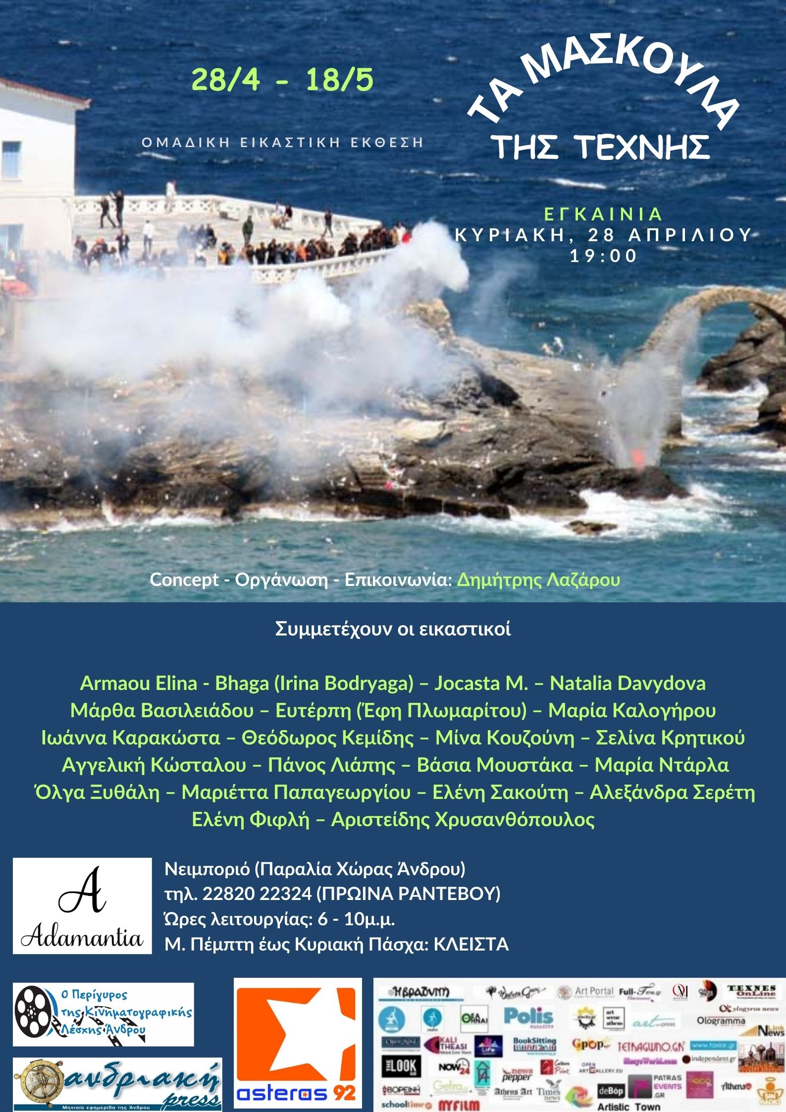 Στο χώρο Τέχνης Αδαμαντία στο Νειμποριό της Άνδρου παρουσιάζεται η ομαδική εικαστική έκθεση «Τα μάσκουλα της Τέχνης»
