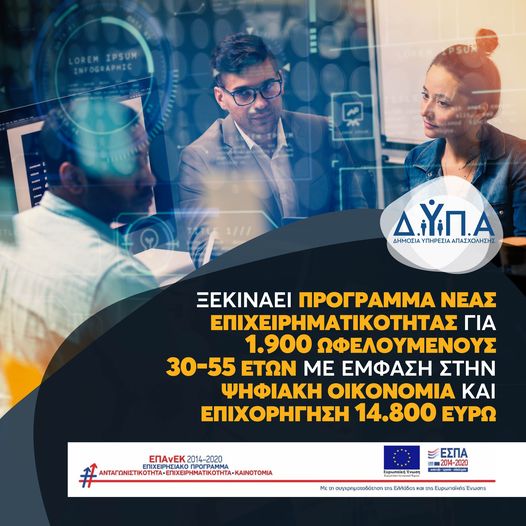 Ξεκινάει πρόγραμμα νέας επιχειρηματικότητας για 1.900 ωφελούμενους 30-55 ετών με έμφαση στην ψηφιακή οικονομία και επιχορήγηση 14.800 ευρώ