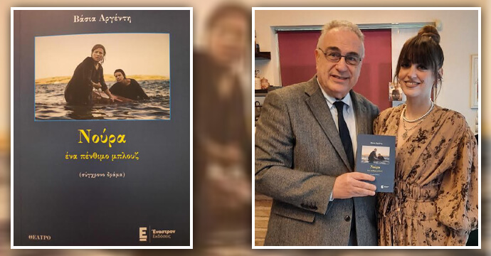 Ο Πρόεδρος της Ε.Σ.Ε. Αλέξανδρος Κακαβάς με τη συγγραφέα του θεατρικού «Νούρα, ένα πένθιμο μπλουζ» Βάσια Αργέντη