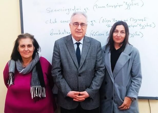 Ο Πρόεδρος της Ε.Σ.Ε. Αλέξ. Κακαβάς με τα μέλη της Λέσχης Φίλων της Ε.Σ.Ε. την πολιτισμιολόγο Μέμα Χαλιώτη και τον Αναπληρωτή Καθηγητή ΕΚΠΑ Ι. Παναγιωτόπουλο στη διάλεξη "Η Ελληνική Εκπαίδευση Σήμερα"
