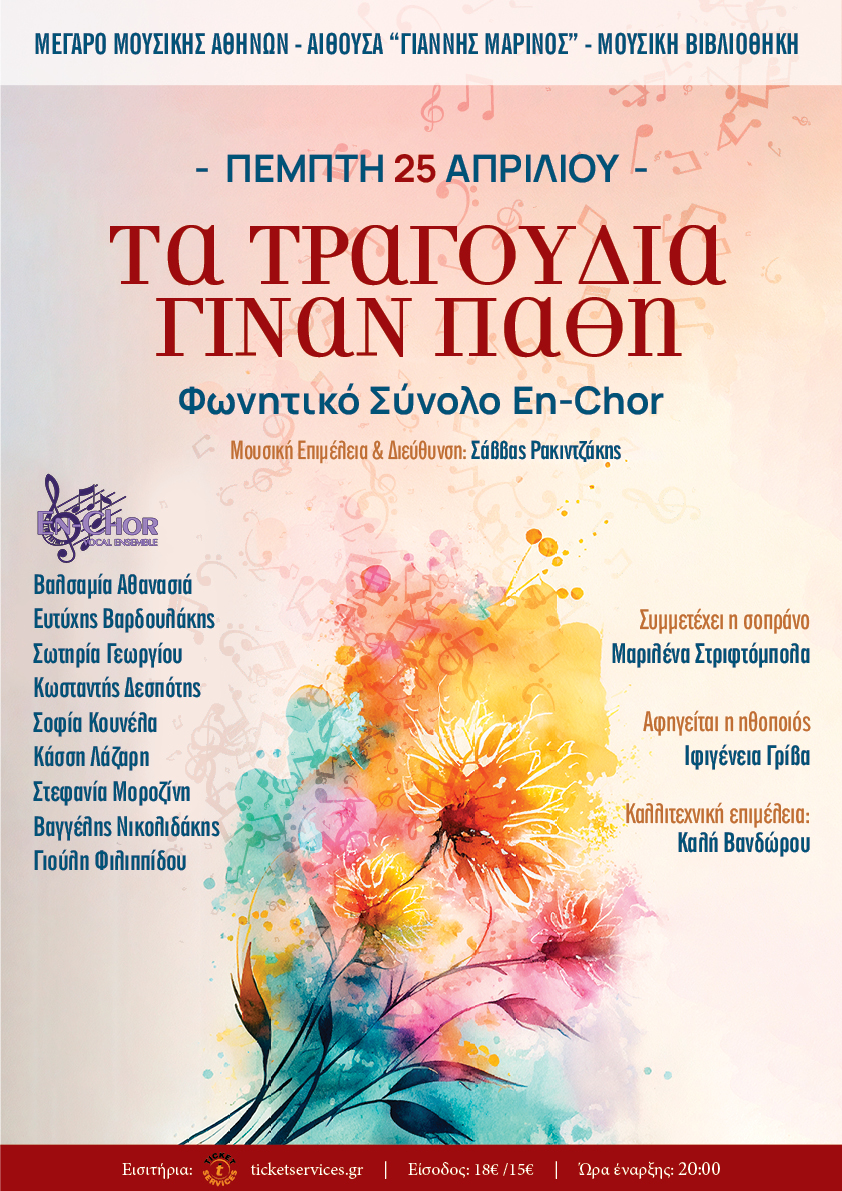 Φωνητικό σύνολο En-Chor, «Τα τραγούδια γίναν πάθη», Πέμπτη 25 Απριλίου 2024 - Μέγαρο Μουσικής Αθηνών