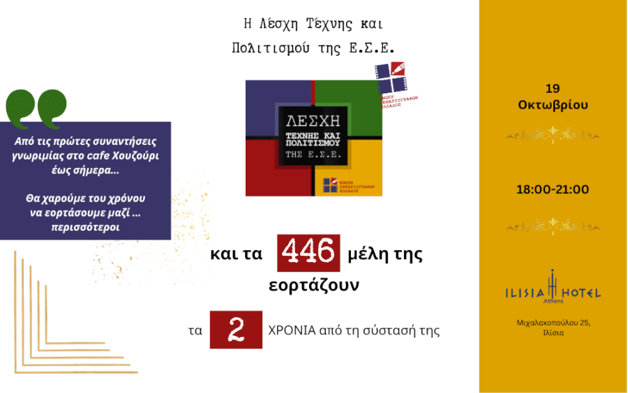 Η Λέσχη Τέχνης και Πολιτισμού της Ένωσης Σεναριογράφων Ελλάδος και τα 446 μέλη της εορτάζουν τα 2 χρόνια από τη σύστασή της