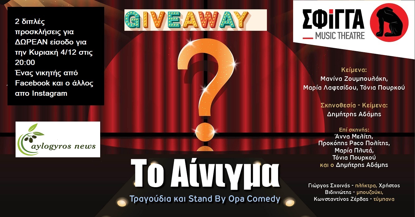 ??ΔΙΑΓΩΝΙΣΜΟΣ: 2 Δίπλες Προσκλήσεις για ΔΩΡΕΑΝ είσοδο για την επιθεώρηση και stand up comedy «Το Αίνιγμα» στη μουσική σκηνή Σφίγγα