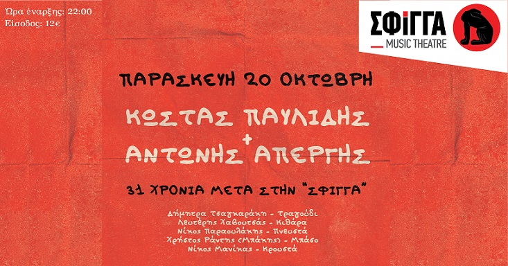 Κώστας Παυλίδης + Αντώνης Απέργης -"31 χρόνια μετά στη Σφίγγα". Παρασκευή 20 Οκτωβρίου
