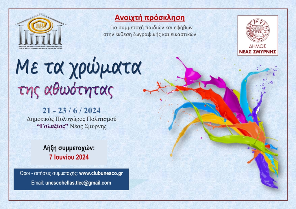 Ανοιχτή πρόσκληση: Για συμμετοχή παιδιών και εφήβων στην ομαδική έκθεση εικαστικών τεχνών, «Με τα χρώματα της αθωότητας» του Ομίλου για την UNESCO Τεχνών, Λόγου & Επιστημών Ελλάδος 21 – 23 Ιουνίου 2024