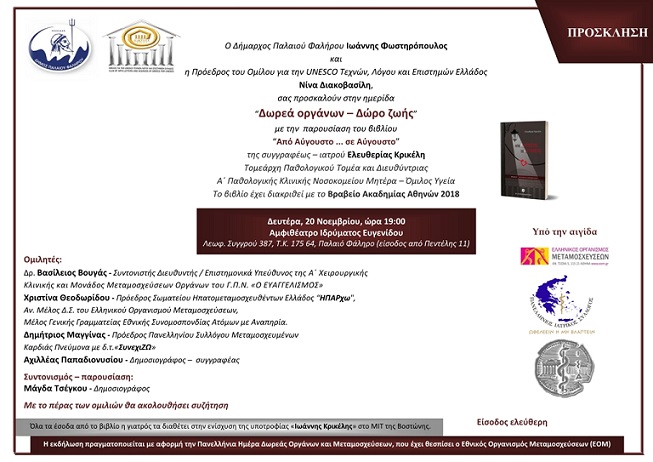 Ημερίδα: «Δωρεά οργάνων – δώρο ζωής» - παρουσίαση του βιβλίου «Από Αύγουστο... σε Αύγουστο» της συγγραφέως – ιατρού Ελευθερίας Κρικέλη