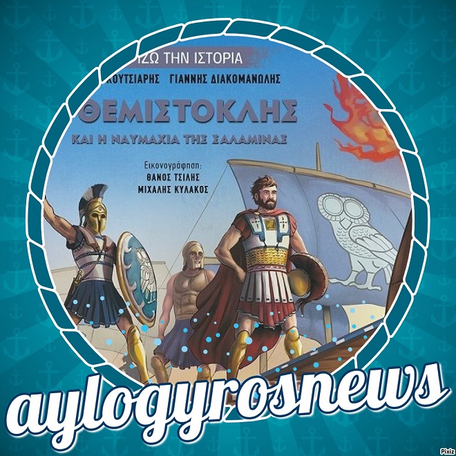 «Ο Θεμιστοκλής και η ναυμαχία της Σαλαμίνας» Βασίλη Κουτσιαρή και Γιάννη Διακομανώλη των στην προθήκη της αυλής μας