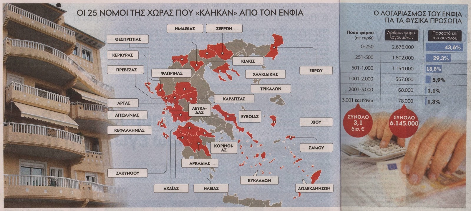 Τα στοιχεία που συγκέντρωσε το «Έθνος» από όλη την Ελλάδα δείχνουν ότι ο ΕΝΦΙΑ «έκαψε» φορολογούμενους σε χωριά, οικισμούς και κωμοπόλεις σε 25 νομούς της χώρας οι οποίοι «εν μια νυκτί» έγιναν Κροίσοι με ακίνητη περιουσία αξίας εκατοντάδων χιλιάδων ή και εκατομμυρίων ευρώ.