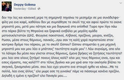 Ένα «σκυλίσιο» Σάββατο με σουβενίρ ένα δάγκωμα εις τα οπίσθιά της, πέρασε η Ντέπυ Γκολεμά, όπως έγραψε η ίδια στο προφίλ της στο Facebook, η γνωστή καλέ δημοσιογράφος και τηλεκριτικός, που όλα τα σφάζει και όλα τα μαχαιρώνει, μετά από ένα «ερωτικό» τετ α τετ που...