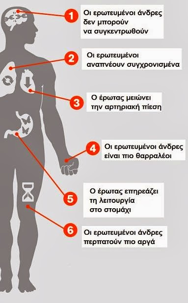 Οι ερωτευμένοι άνδρες δεν μπορούν να συγκεντρωθούν: Μελέτη που πραγματοποιήθηκε από το Πανεπιστήμιο του Μέριλαντ δείχνει ότι οι άνδρες που βρίσκονται σε μια νέα σχέση κατακλύζονται από τις σκέψεις της συντρόφου τους. Το αποτέλεσμα είναι να μην μπορούν να εστιάσουν την προσοχή τους σε άλλα πράγματα.