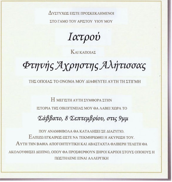 Η πιο ξεκαρδιστική πρόσκληση γάμου που έχετε διαβάσει… Aylogyros News Η παλιά μας αυλή 17 Ιανουαρίου 2014 Μια πολύτιμη πρόσκληση γάμου, από την μητέρα του γαμπρού…(7imeres) Προηγούμενο Επόμενο