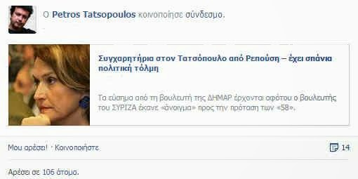 Συγκεκριμένα ο Πέτρος Τατσόπουλος κοινοποίησε άρθρο στο οποίο η Μαρία Ρεπούση του έστελνε συγχαρητήρια για την άποψή του πως δεν πρέπει να καταδικάζει εξ αρχής το κίνημα των 58 για την Κεντροαριστερά γιατί στο μέλλον ο ΣΥΡΙΖΑ ίσως χρειαστεί να συνεργαστεί με ορισμένους από αυτούς.