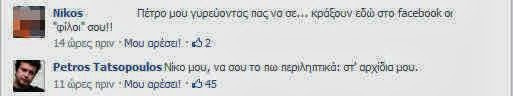 Από την πλευρά του ο βουλευτής του ΣΥΡΙΖΑ κοινοποίησε σχετικό σύνδεσμο από ειδησεογραφικό σάιτ χωρίς σχόλια. Ωστόσο ένας χρήστης του έγραψε «Πέτρο μου γυρεύοντας πας να σε... κράξουν εδώ στο facebook οι "φίλοι" σου!!», με τον Πέτρο Τατσόπουλο να απαντά: «Νίκο μου, να σου το πω περιληπτικά: στ' αρχίδια μου»...
