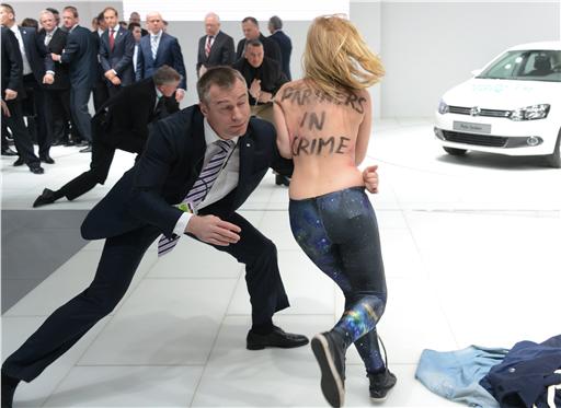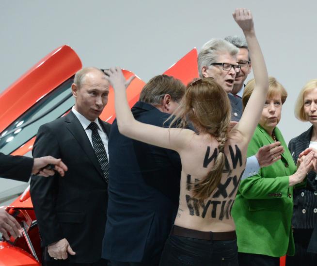 Ο Πούτιν και η Μέρκελ ήταν στο περίπτερο της γερμανικής αυτοκινητοβιομηχανίας Volkswagen, συνοδευόμενοι από τον πρόεδρο του ομίλου Μάρτιν Βίντερκορν, όταν τέσσερις γυναίκες που φώναζαν "Fuck dictator!" (Άι γ..., δικτάτορα!), όρμησαν πάνω στην εξέδρα.