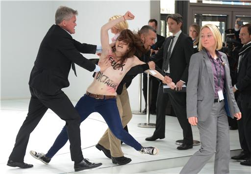 Σε εικόνες που μετέδωσε το γερμανικό τηλεοπτικό δίκτυο συνεχούς ενημέρωσης NTV, βλέπει κανείς δύο από τις κοπέλες, που είχαν γραμμένο στο σώμα τους με μαύρη μπογιά το σύνθημα που φώναξαν, να τίθενται με δυσκολία υπό έλεγχο από την αστυνομία.
