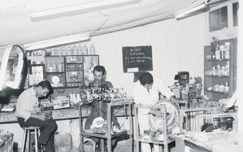 Τεχνίτες σε εργαστήριο επισκευής ηλεκτρικών συσκευών στην οδό Πατησίων το 1965. (ΕΛΙΑ)