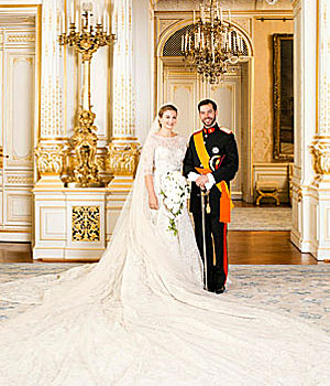 Η δούκισσα από το Βέλγιο παντρεύτηκε τον πρίγκιπα του Λουξεμβούργου σε μία παραμυθένια τελετή, με όλες τις βασιλικές τελετουργίες που ορίζει το πρωτόκολλο. Το νυφικό, που δημιουργήθηκε από την Ellie Saab, ήταν από ιβουάρ δαντέλα, με ασημένια κεντήματα. Τα μανίκια είχαν μήκος τριών τετάρτων, ενώ η ουρά είχε μήκος περισσότερο από 3,5 μέτρα. Επίσης, στο κεφάλι της τοποθετήθηκε μία υπέροχη τιάρα με τούλι.