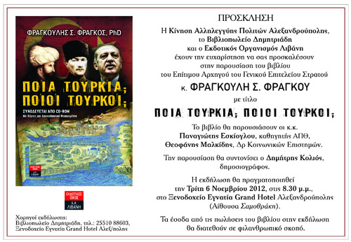 Η Κίνηση Αλληλεγγύης Πολιτών Αλεξανδρούπολης οργανώνει εκδήλωση παρουσίασης του βιβλίου «Ποια Τουρκία; Ποιοι Τούρκοι;» του πρώην Υπουργού Εθνικής Άμυνας και Επίτιμου Αρχηγού του Γενικού Επιτελείου Στρατού, Στρατηγού Φράγκου Φραγκούλη.