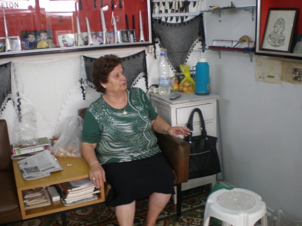 Η σύζυγος του Βασίλη Ψυχαράκη στο κουρείο του που ήμερα πουλάει μαχαίρια, κομπολόγια, κρητικά κεφαλομάντηλα και άλλα χειροτεχνήματα.