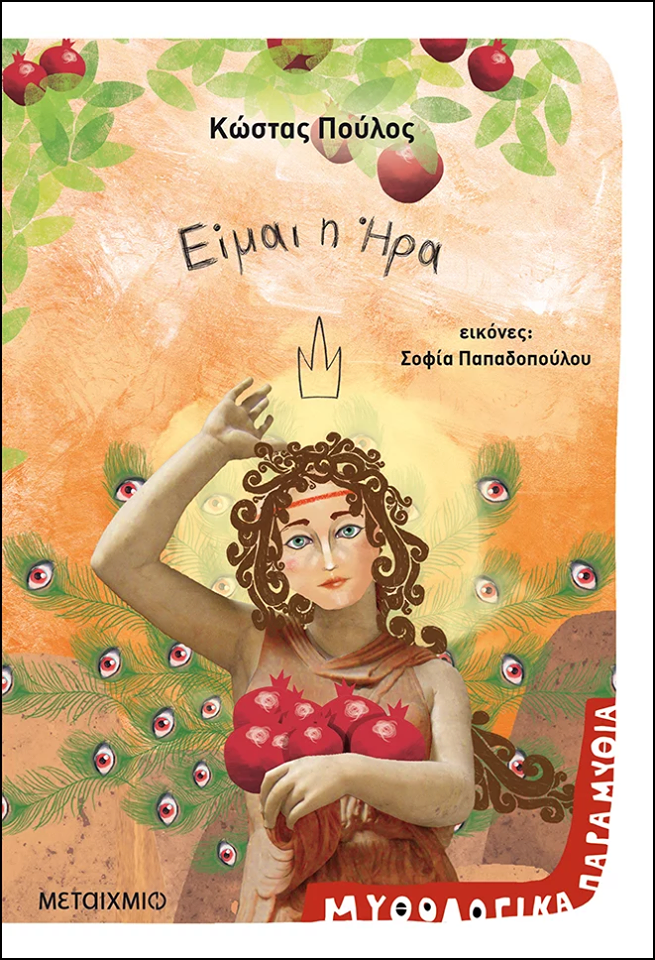 Απ’ όλα τα φρούτα πιο πολύ μου αρέσει το ρόδι. Από τα ζώα, εκτός από τον κούκο, μου αρέσει πολύ το παγόνι. Όταν με βλέπει, ανοίγει την πολύχρωμη ουρά του σαν βεντάλια. Έχει πάνω της αμέτρητα ζωγραφισμένα μάτια που κοιτάζουν με απορία. Είμαι η Ήρα, η γυναίκα του Δία, του πατέρα των θεών και των ανθρώπων.