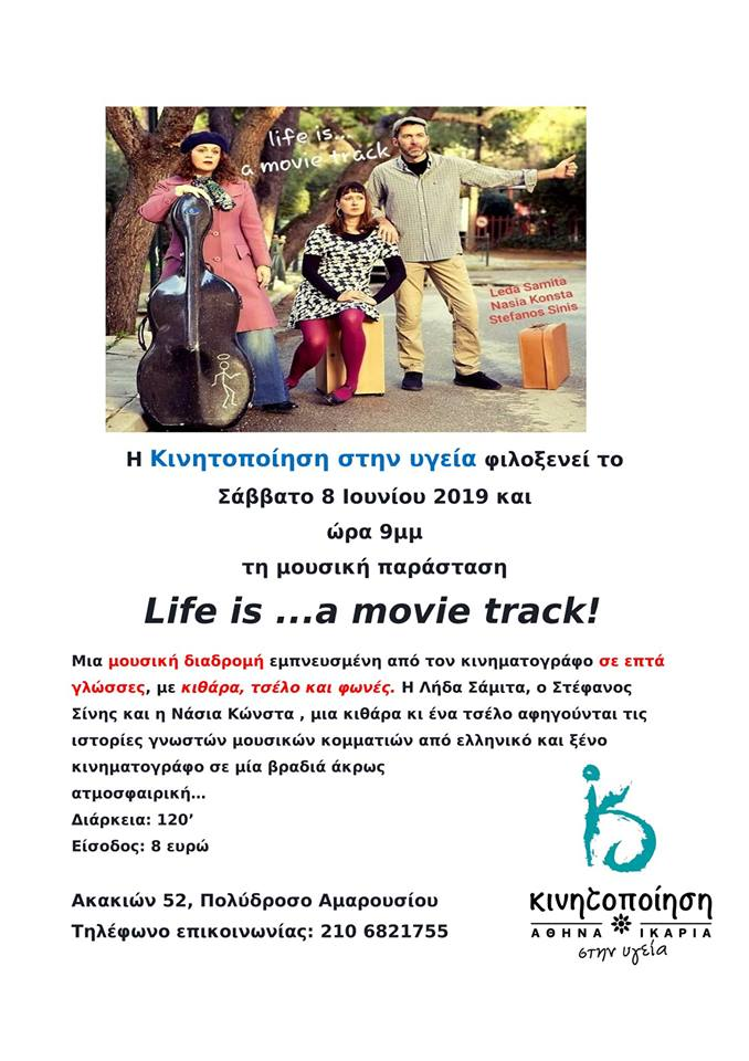 με πρωτοποριακά ολιστικά προγράμματα φυσικοθεραπείας, ευεξίας και γενικότερης υγείας, φιλοξενεί το Σάββατο 8 Ιουνίου 2019 στις 9 το βράδυ τη μουσική παράσταση Life is ...a movie track!Η Κινητοποίηση στην υγείας, πρωτίστως αγαπά τη μουσική. Δίνει ώθηση ψυχική, δίνει ρυθμό στο σώμα ενώ το τραγούδι βοηθά στη σωστή αναπνοή και ενισχύει τις φωνητικές μας χορδές! Παράλληλα η μουσική ενώνει γενιές...σε μια μουσική παράσταση για όλες τις ηλικίες.... υπό το φως των κεριών!