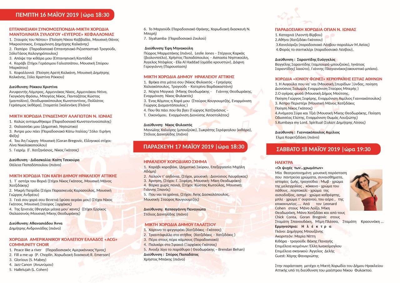 Την Πέμπτη 16 και την Παρασκευή 17 Μαΐου το Φεστιβάλ αρχίζει στις 18.30, ενώ το Σάββατο στις 19.30 οπότε θα παρουσιαστούν «Οι Ψυχές των Χρωμάτων», μια θεατροποιημένη μουσική παράσταση που παντρεύει χρώματα, συναισθήματα και τραγούδια. Ερμηνεύει η Ηλέκτρα. Συμμετέχει η Μικτή Χορωδία του Δήμου Ηρακλείου Αττικής υπό την διεύθυνση του μαέστρου Νίκου Φυλακτού.
