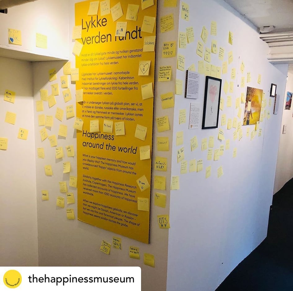 Μουσείο Ευτυχίας.Στις αίθουσες του μουσείου ο επισκέπτης λαμβάνει τις πληροφορίες οι οποίες αναγράφονται σε μεγάλα χρωματιστά πανό, που έχουν κρεμαστεί στους λευκούς τοίχους, έτσι ώστε να μάθει τα πάντα για τη θεωρία της ευτυχίας.