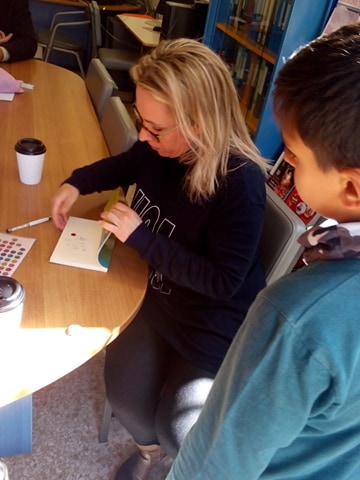 Ξανά μέσα στις τάξεις, για να υπογράψει η συγγραφές στους μικρούς βιβλιόφιλους το βιβλίο της και να τους αποχαιρετήσει δίνοντάς τους αναμνηστικά δωράκια από «Τα φτερωτά σανδάλια του μικρού Παυσανία».