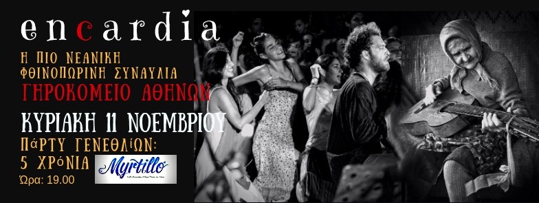 Στις 11 Νοεμβρίου σε ένα ιδιαίτερο χώρο, στο θέατρο του φορτισμένου με μνήμες, του ιστορικού Γηροκομείου Αθηνών οι Εncardia γιορτάζουν μαζί με το Μyrtillo και παράλληλα τιμούν όλους τους επώνυμους και ανώνυμους που έζησαν εδώ τα τελευταία χρόνια της ζωής τους. Προσκεκλημένοι και οι σημερινοί τρόφιμοι του Γηροκομείου θα συμμετάσχουν στην πιο νεανική συναυλία του Φθινοπώρου.