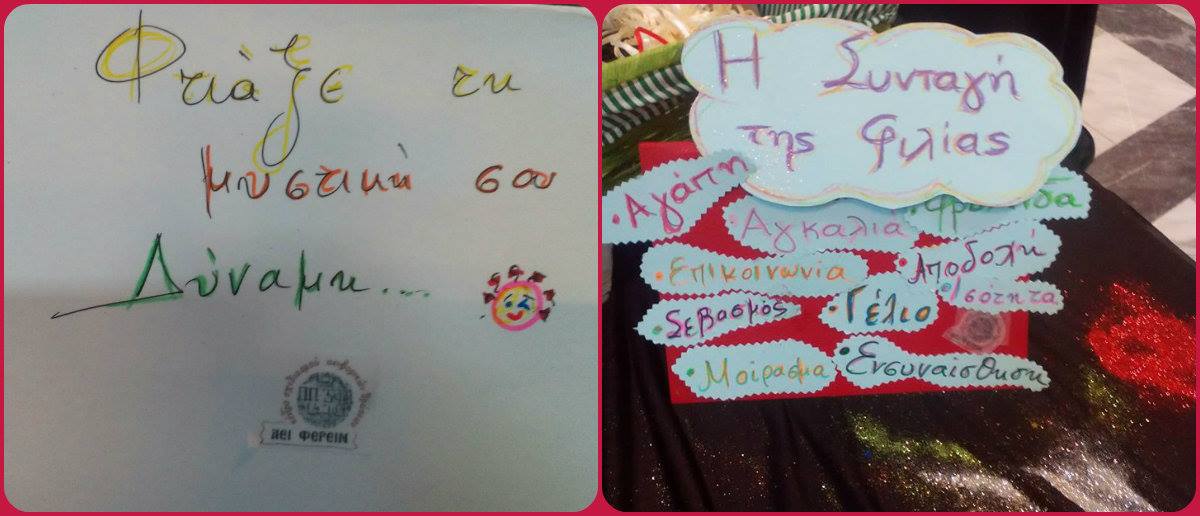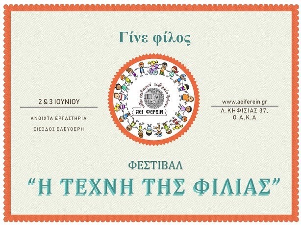 «Η τέχνη της Φιλίας» στο πρότυπο επιστημονικό Κέντρο σχεδιασμού αειφορικών δράσεων και εφαρμογής αναπτυξιακών προγραμμάτων στην Εκπαίδευση και τον Πολιτισμό, ΑΕΙ ΦΕΡΙΝ, στο ΟΑΚΑ.Ένα διήμερο με πλούσιες δράσεις, με κύριο σκοπό να πετύχουμε τη «σωστή» για τον καθένα ξεχωριστά συνταγή της φιλίας…