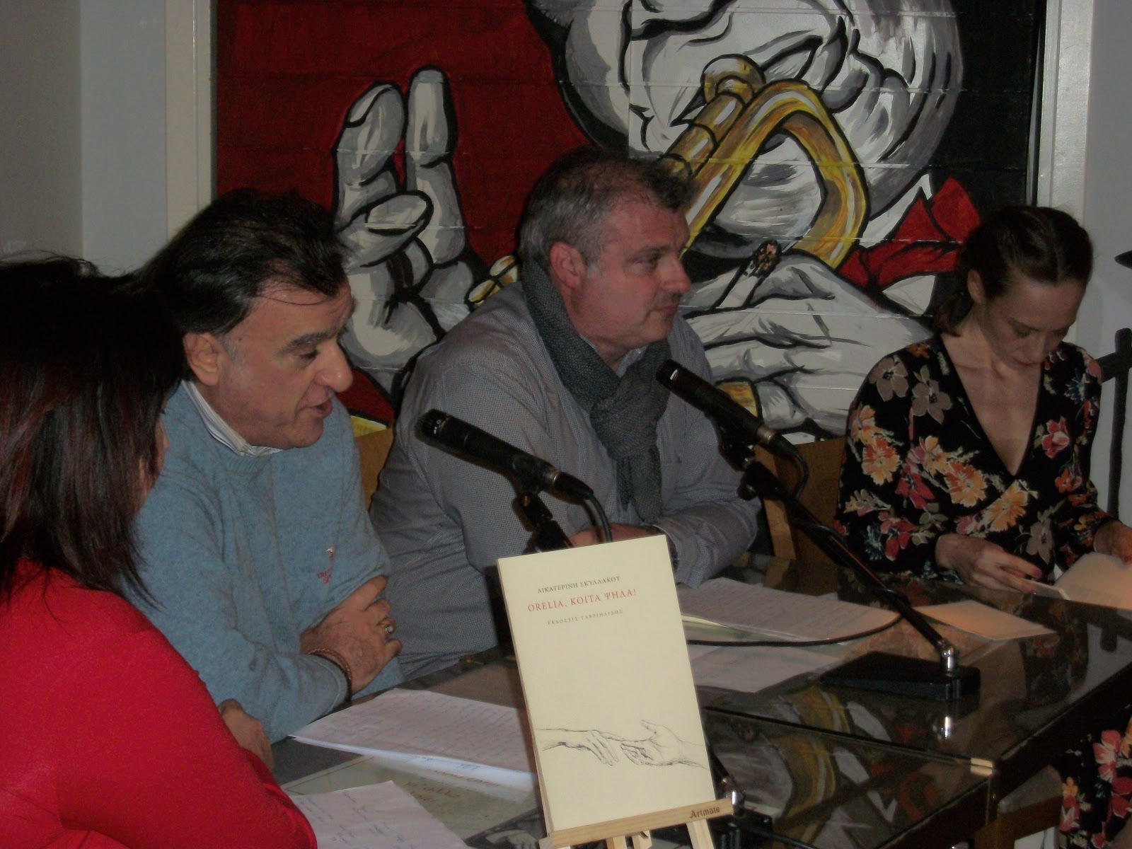 Γαβριηλίδης POEMS&CRIMES στο Μοναστηράκι, παρουσίασε το βράδυ της Παρασκευής η Αικατερίνη Σκυλλάκου την πρώτη της ποιητικής συλλογής «Orellia, κοίτα ψηλά!», με τον ποιητή Γιώργο Γώτη, να προλογίζει, δίνοντας το στίγμα αυτού του ποιητικού έργου, με την ηθοποιό Μίνα Καθέρη να απαγγέλλει «αποσπάσματα» και τη μουσικό Αναστασία Μηλιώρη να τη συνοδεύει με το βιολί της.Στη συνέχεια ο φιλόλογος και πρόεδρος του συνδέσμου φιλολόγων Πύργου-Ολυμπίας Παναγιώτης Γεωργακόπουλος, πήρε το λόγο, λέγοντας χαρακτηριστικά πως αυτή η ποιητική συλλογή αποτελεί μια παλέτα χρωμάτων, καθώς τα 47 ποιήματα που «γεμίζουν» τις σελίδες του βιβλίου, είναι ποιήματα αισιοδοξίας, με ήχους που σε κρατούν σε εγρήγορση, δίχως να σου διακόπτουν τη ροή των συναισθημάτων.