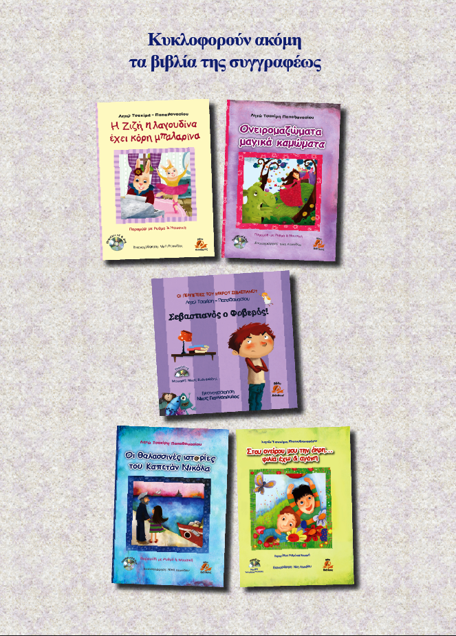 Οι μουσικές της ιστορίες που ξεκλειδώνουν τα παιδικά συναισθήματα με γενικό τίτλο «ΜΟΥΣΙΚΑ ΠΑΡΑΜΥΘΙΑ ΣΥΝΑΙΣΘΗΜΑΤΩΝ» κυκλοφορούν από τις Εκδόσεις ΔΙΑΠΛΟΥΣ με τα βιβλία «Η ΖΙΖΗ Η ΛΑΓΟΥΔΙΝΑ ΕΧΕΙ ΚΟΡΗ ΜΠΑΛΑΡΙΝΑ» , «ΟΙ ΘΑΛΑΣΣΙΝΕΣ ΙΣΤΟΡΙΕΣ ΤΟΥ ΚΑΠΕΤΑΝ ΝΙΚΟΛΑ», «ΟΝΕΙΡΟΜΑΖΩΜΑΤΑ ΜΑΓΙΚΑ ΚΑΜΩΜΑΤΑ», «ΣΤΟΥ ΟΝΕΙΡΟΥ ΜΟΥ ΤΗΝ ΑΚΡΗ…ΦΙΛΙΑ ΕΧΩ & ΑΓΑΠΗ» Εικονογράφος της σειράς η Νίκη Λεωνίδου.