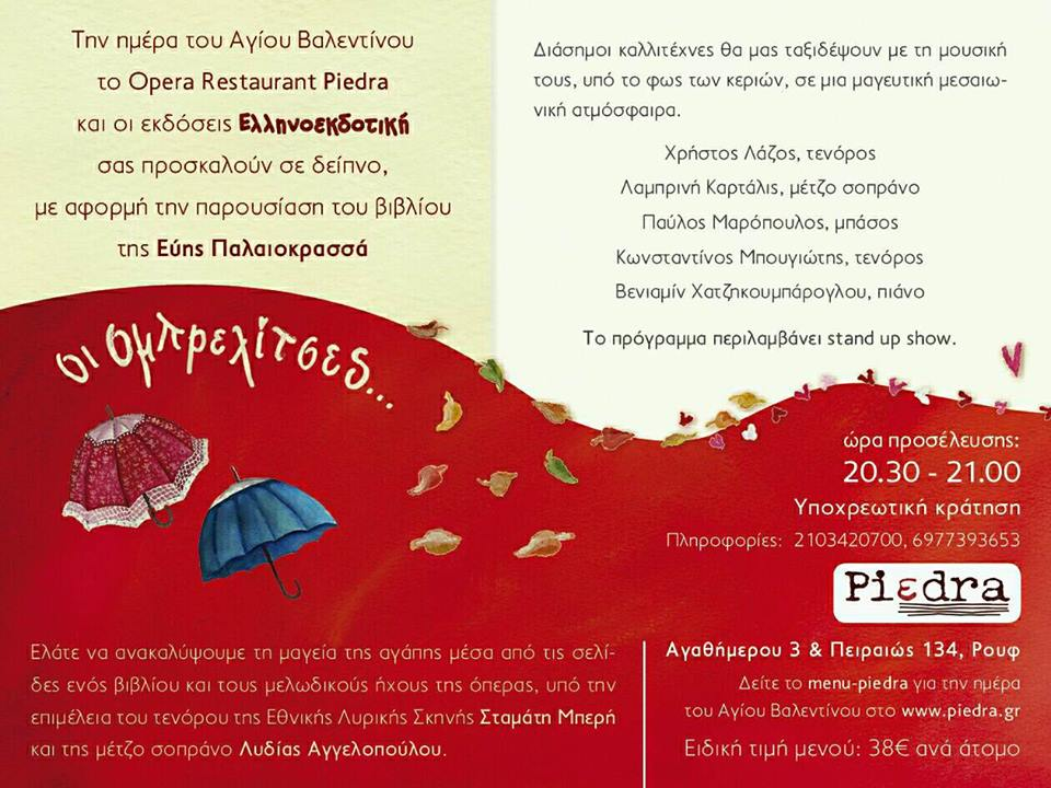 μέσα από τις σελίδες ενός βιβλίου και τους μελωδικούς ήχους της όπερας… Οι εκδόσεις Ελληνοεκδοτική σας προτείνουν την ημέρα του Αγίου Βαλεντίνου μια ξεχωριστή βραδιά στο Piedra Opera Restaurast (αγαθήμερου 3 & Πειραιώς 134, Ρουφ).Με αφορμή την παρουσίαση του βιβλίου «Οι ομπρελίτσες» της Εύης Παλαιοκρασσά, οι εκδόσεις σας προσκαλούν σε δείπνο. Μέσα από τις σελίδες ενός βιβλίου και τους μελωδικούς ήχους της όπερας, ανακαλύψτε τη μαγεία της αγάπης.