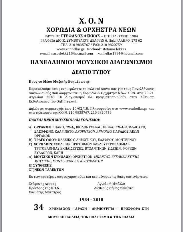 για 34ο χρόνο τους παρακάτω Πανελλήνιους διαγωνισμούςΑ΄ Νέους Ηλικίας 4-25 ετών(σπουδαστές), Διπλωματούχους έως 35 ετών και Β' Ανεξαρτήτως ηλικίας για Έλληνες που κατοικούν στη επικράτεια και το εξωτερικό.