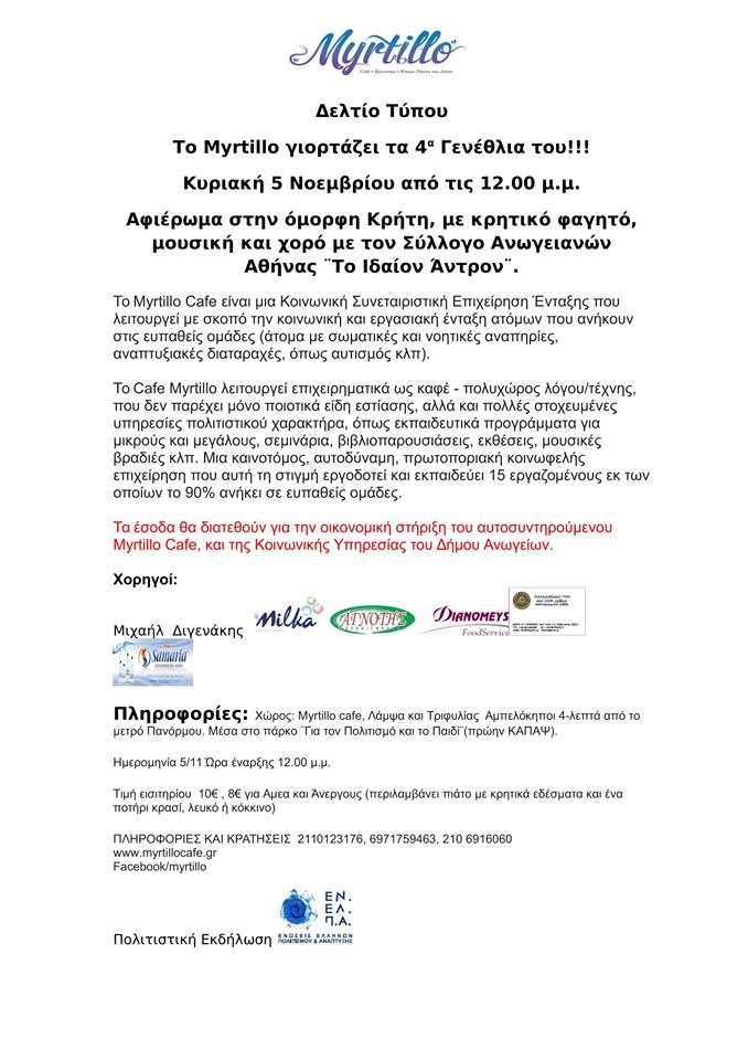 Αφιέρωμα στην όμορφη Κρήτη, με κρητικό φαγητό, μουσική και χορό με τον Σύλλογο Ανωγειανών Αθήνας ¨Το Ιδαίον Άντρον¨.Τα έσοδα θα διατεθούν για την οικονομική στήριξη του αυτοσυντηρούμενου Myrtillo Cafe, και της Κοινωνικής Υπηρεσίας του Δήμου Ανωγείων.