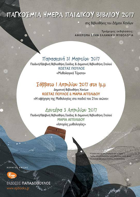 • Η συγγραφέας Μαρία Αγγελίδου θα επισκεφθεί τη Δευτέρα 3 Απριλίου τις βιβλιοθήκες του Δήμου Χανίων για να παρουσιάσει την τετράτομη σειρά ελληνικής μυθολογίας Ταξίδια στη Μυθολογία που εικονογράφησε η Ίρις Σαμαρτζή.