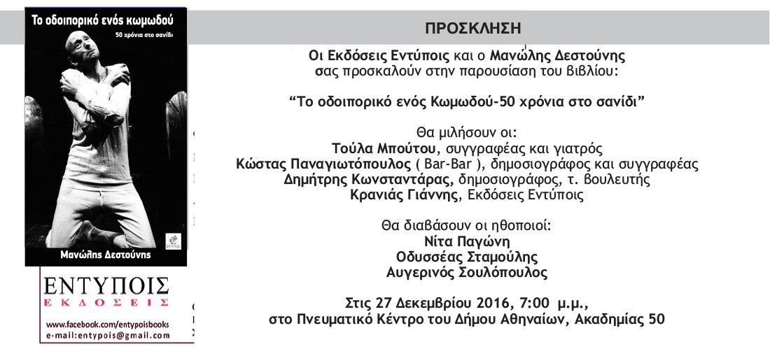 Η επίσημη παρουσίαση του βιβλίου ''Το οδοιπορικό ενός Κωμωδού - 50 χρόνια στο σανίδι'', θα πραγματοποιηθεί την Τρίτη 27 Δεκεμβρίου 2016, στις 19:00, στο Πνευματικό Κέντρο Δήμου Αθηναίων, Ακαδημίας 50, Αθήνα