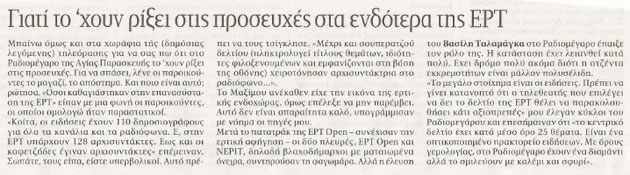 κατά «ΤΑ ΝΕΑ»Για ενδοσκόπηση, απόστημα, προσευχές, αλλά και απουσία κυβερνητικής παρέμβασης στην ΕΡΤ διαπιστώνει σε ρεπορτάζ του ο «Μικροπολιτικός» της εφημερίδας «ΤΑ ΝΕΑ».