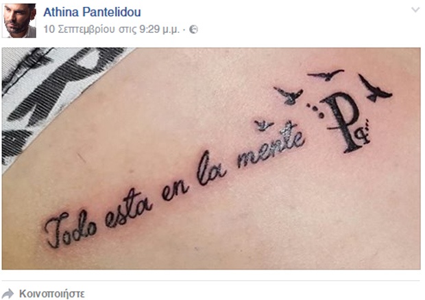 Η Αθηνά Παντελίδου, ανέβασε στον προσωπικό της λογαριασμό στο Facebook μια φωτογραφία με ένα τατουάζ με τη φράση "Todo esta en la mente" (όλα είναι στο μυαλό) από το τραγούδι του γιου της «Λιώμα σε γκρεμό»… (news)