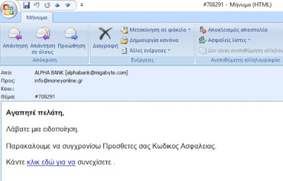 καθώς οι επιθέσεις από επιτήδειους για την υποκλοπή των κωδικών τους είναι συνεχείς. Τι δεν πρέπει να κάνετε. Ο λόγος γίνεται για τη μέθοδο phishing, μέσω της οποίας οι ηλεκτρονικοί «ληστές» αποκτούν πρόσβαση στο λογαριασμό όσων «την πατήσουν». Ο χρήστης του e-banking δέχεται ένα απατηλό e-mail, που του ζητά να επισκεφθεί την ιστοσελίδα της τράπεζας για κάποιο σημαντικό λόγο.Χαρακτηριστικό παράδειγμα το ακόλουθο e-mail που απεστάλη, υποτίθεται, από την Alpha Bank: