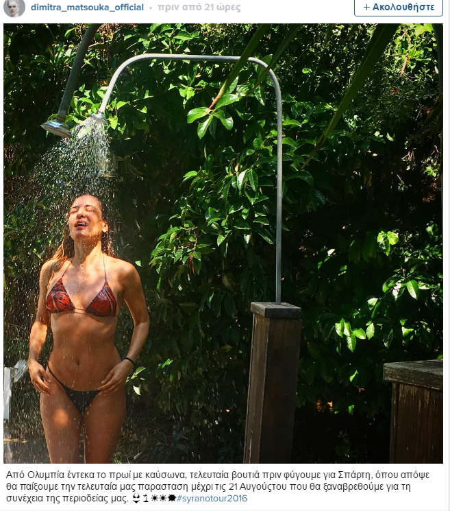Συρανό Ντε Μπερζεράκ σε όλη την Ελλάδα, αλλά, παράλληλα, κάνει κι έναν χαμό σε κάθε ευκαιρία! Ανάμεσα στις παραστάσεις, η ηθοποιός απολαμβάνει το μπανάκι της. Μετά τη θάλασσα ή την πισίνα, όμως, χρειάζεται ένα ντους για να ξεπλυθείς…Με το μικροσκοπικό μπικίνι της, η Δήμητρα Ματσούκα κάθισε κάτω από τη ντουζιέρα και άφησε το νερό να κυλά στο κορμί της…