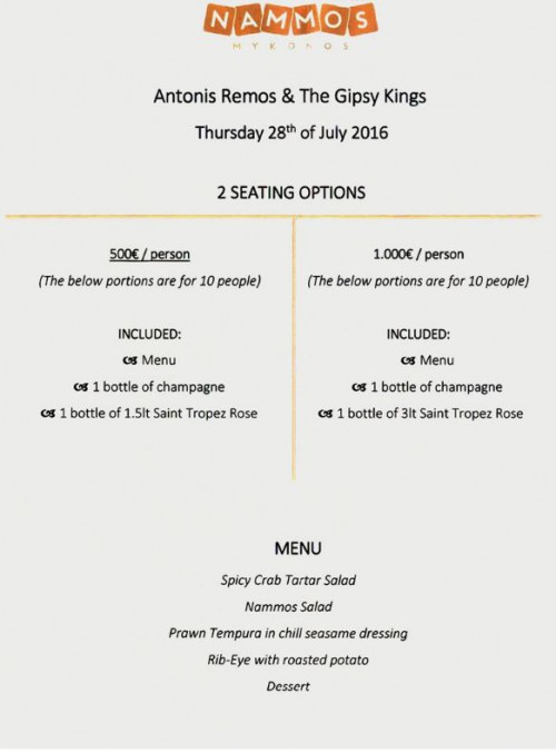 στη Μύκονο οι εισπράξεις θα σημειώσουν limit up από την κοινή εμφάνιση του Αντώνη Ρέμου με τους Gipsy Kings.Σύμφωνα με το «Πρώτο Θέμα» οι τιμές κατ΄ άτομο για τη συγκεκριμένη βραδιά ξεκινάνε από 1.000 ευρώ!