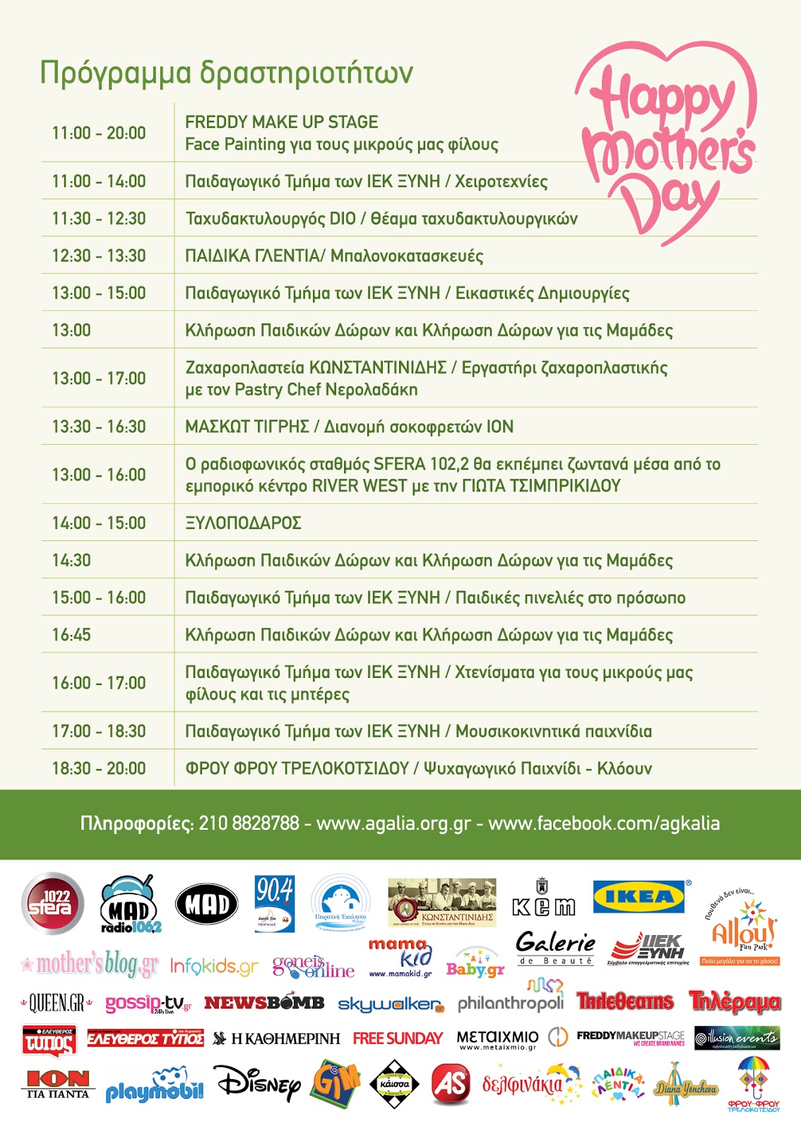 Η γιορτή θα κορυφωθεί τη Κυριακή 8 Μαΐου (11:00 έως τις 20:00), όταν «Η Αγκαλιά» θα υποδεχτεί στο εμπορικό κέντρο RIVER WEST τους μικρούς επισκέπτες με μουσικά παιχνίδια, event με ξυλοπόδαρους, κλόουν, ταχυδακτυλουργικά, κατασκευές και ζωγραφική, αλλά και πολλές εκπλήξεις και δώρα για τα παιδιά και τη Μαμά. Τα Ζαχαροπλαστεία «ΚΩΝΣΤΑΝΤΙΝΙΔΗΣ» θα δώσουν χαρά και θα μυήσουν τους μικρούς chef στα μυστικά της ζαχαροπλαστικής, ο ταχυδακτυλουργός Dio θα “μαγέψει” τους μικρούς μας φίλους, ενώ η σχολή του make-up artist Φρέντυ Καλομπράτσου θα δώσει “χρώμα” στην εκδήλωση με την τέχνη του face painting. Οι σπουδαστές του τμήματος παιδαγωγικών των ΙΕΚ Ξυνή θα ψυχαγωγήσουν τα παιδιά με μουσικοκινητικά παιχνίδια και δημιουργικές κατασκευές. Επίσης πλήθος εθελοντών θα πλαισιώσουν χαρούμενα και δημιουργικά την εκδήλωση (Παιδικά Γλέντια με μπαλονοκατασκευές, Φρου-Φρου Τρελοκοτσιδού, κ.ά.) και κατά τη διάρκεια της εκδήλωσης θα πραγματοποιηθούν κληρώσεις από το Σύλλογο «Η Αγκαλιά» με πλούσια δώρα για τη Μαμά και το παιδί…