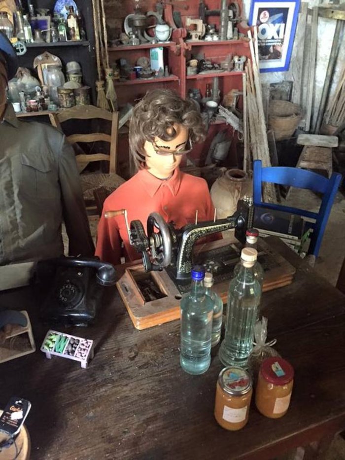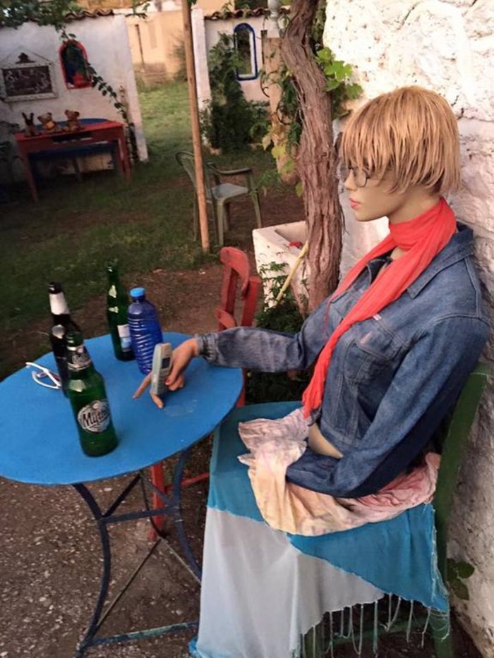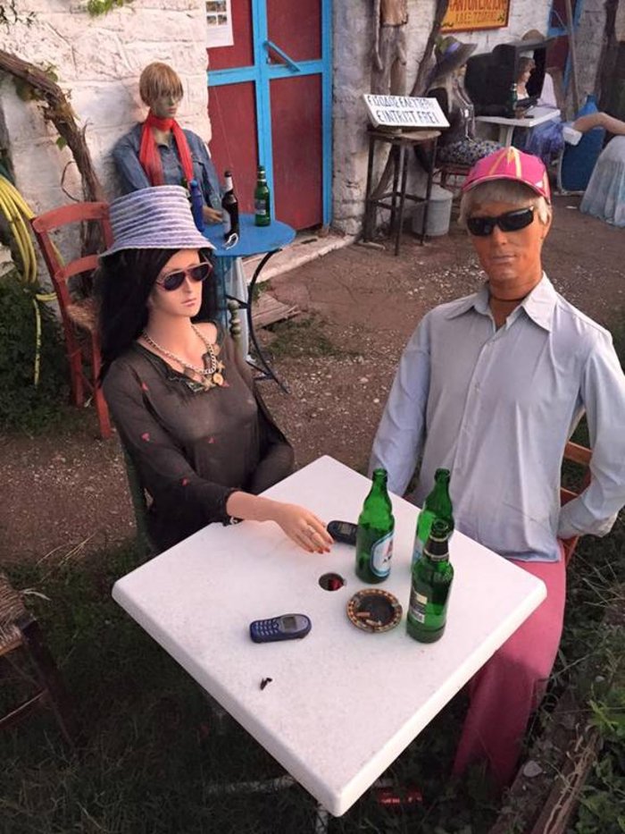 Κούκλες βιτρίνας μοιάζουν με πραγματικούς κατοίκους και επισκέπτες του χωριού, ενώ κάθονται κάτω από την κληματαριά, στο μπαλκόνι και μέσα στο οίκημα.
