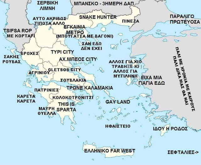 Ο χάρτης «μυστήριο» της Ελλάδας… που μας εκπλήσσει!!! (foto) Aylogyros News Η παλιά μας αυλή 19 Φεβρουαρίου 2016 Κυκλοφορεί στο διαδίκτυο…απ’ όπου και τον συλλέξαμε (mikroskopio) δίχως κανείς να λέει ποιος τον έφτιαξε! Όπως και να έχει όμως, το θετικό είναι ότι λέει κάποιες «αλήθειες», αλλά έχει και πολύ γέλιο… Προηγούμενο Επόμενο