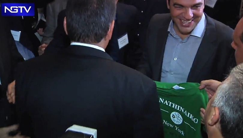 ο πρωθυπουργός μας καθώς με αυτό επέστρεψε στην Ελλάδα από την Νέα Υόρκη. Το συμβολικό αυτό δώρο, επεφύλαξε στον Έλληνα Πρωθυπουργό αντιπροσωπεία του Συνδέσμου Φιλάθλων Παναθηναϊκού Νέας Υόρκης «Panatha USA», αμέσως μετά την ομιλία του στο Γενικό Προξενείο της Ελλάδας στην Αμερικανική πόλη.Μάλιστα, ο κ. Τσίπρας, γνωστός φίλαθλος του Παναθηναϊκού, δεν παρέλειψε να φωτογραφηθεί με τα μέλη του συνδέσμου, Βλάση Αναστασίου και Νίκο Μπάρδη, κρατώντας το εν΄λόγω μπλουζάκι… (e-soccer)