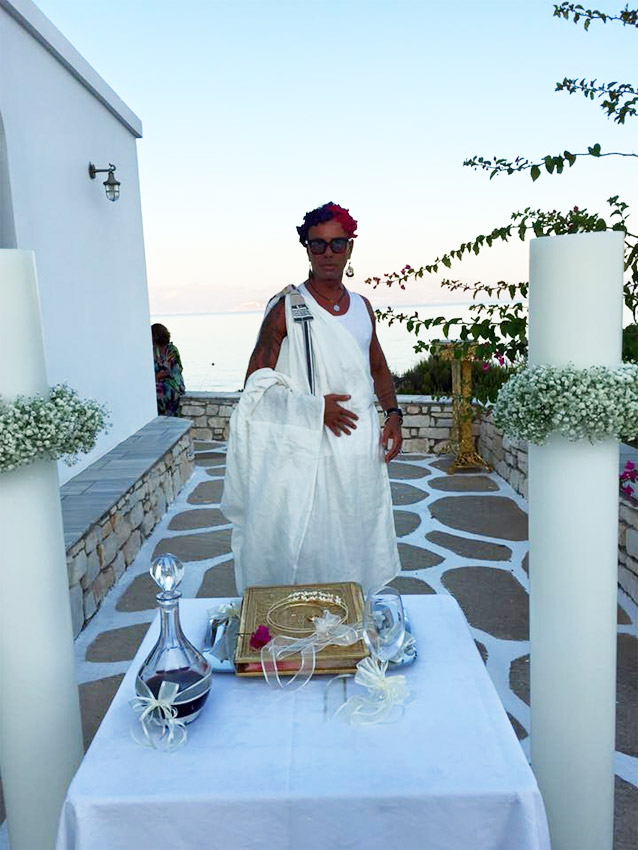 Με λευκό μακρύ χιτώνα, λουλούδια στο κεφάλι και σκουλαρίκια, ο Λάκης Γαβαλάς έγινε κουμπάρος στον γάμο του καλού του φίλου...
