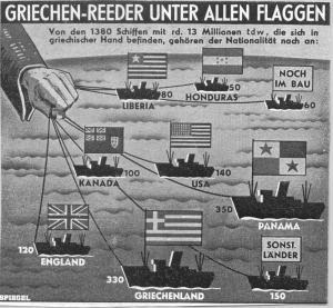 Περιοδικό DER SPIEGEL ( Μάρτιος 1954 ) με εξώφυλλο τον Ωνάση και τον αριθμό των εμπορικών πλοίων έλληνικής ιδιοκτησίας και με σημαίες ευκαιρίας. Σύνολο 1350 πλοία 13 εκατομμυρίων τόνων !!! παγκόσμιο ακατάρριπτο ρεκόρ όλων των εποχών. Πληρώματα χιλιάδες Έλληνες ναυτικοί… (http://liberopoulos.gr)